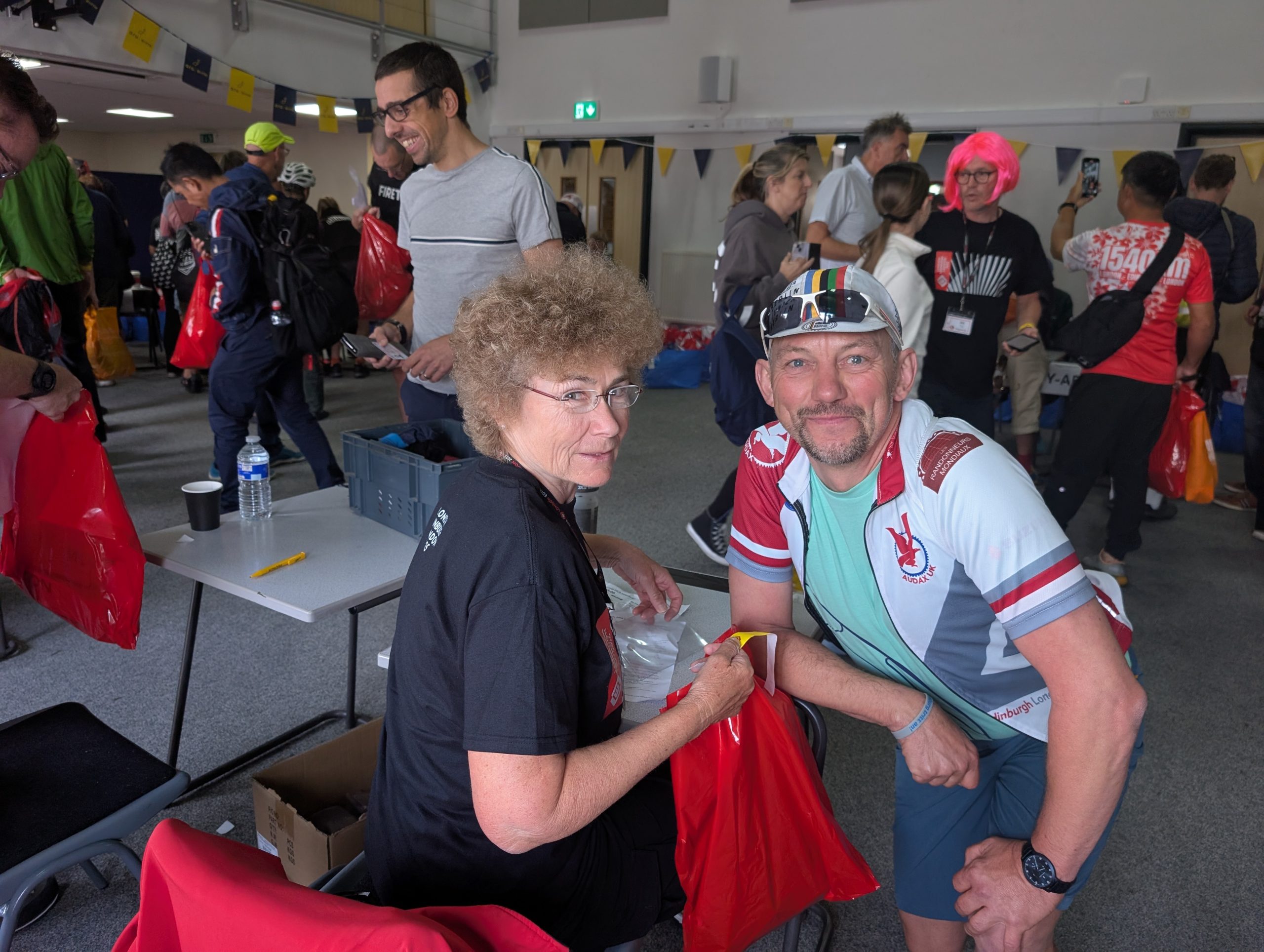 Bei der Abholung der Startunterlagen traf ich gleich mal Bärbel vom Audax Club SH. Was für ein Zufall, Bärbel war als Volunteer bei LEL dabei und gab mir meine Unterlagen raus. Im weiteren Verlauf des Tages gab es noch viele weitere Hallo´s und Shake Hands mit befreundeten Radfahrern. Ein besonderes Treffen war mit meinem brasilianischen Radfreund Leandro. Ihn kenne ich seit PBP 2023 und wir sind in Italien im letzten Jahr bei 1001 Mille Miglia ein Stück zusammengefahren. Das Wiedersehen war herzlich. Wir tauschten Radsachen aus und verabredeten uns lose nach der Tour im Ziel, ich hatte vorausschauend Bier im Auto mitgebracht.